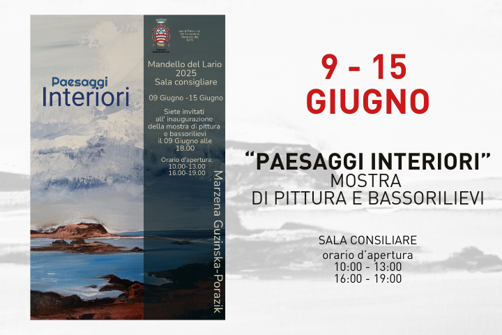 Marzena Guzinska - Porazik, con il Patrocinio del Comune di Mandello del Lario, vi invitano a visitare la mostra di pittura e bassorilievi "Paesaggi interiori", dal 9 al 15 giugno in Sala Consiliare.