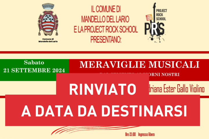 Siamo spiacenti di dover comunicare che l'evento "MERAVIGLIE MUSICALI" Dal 600 ai giorni nostri, con Gianfranco D'Elia al pianoforte e Adriana Ester Gallo al violino" programmato per sabato 21 settembre in Piazza Italia è stato rinviato a data da destinarsi.