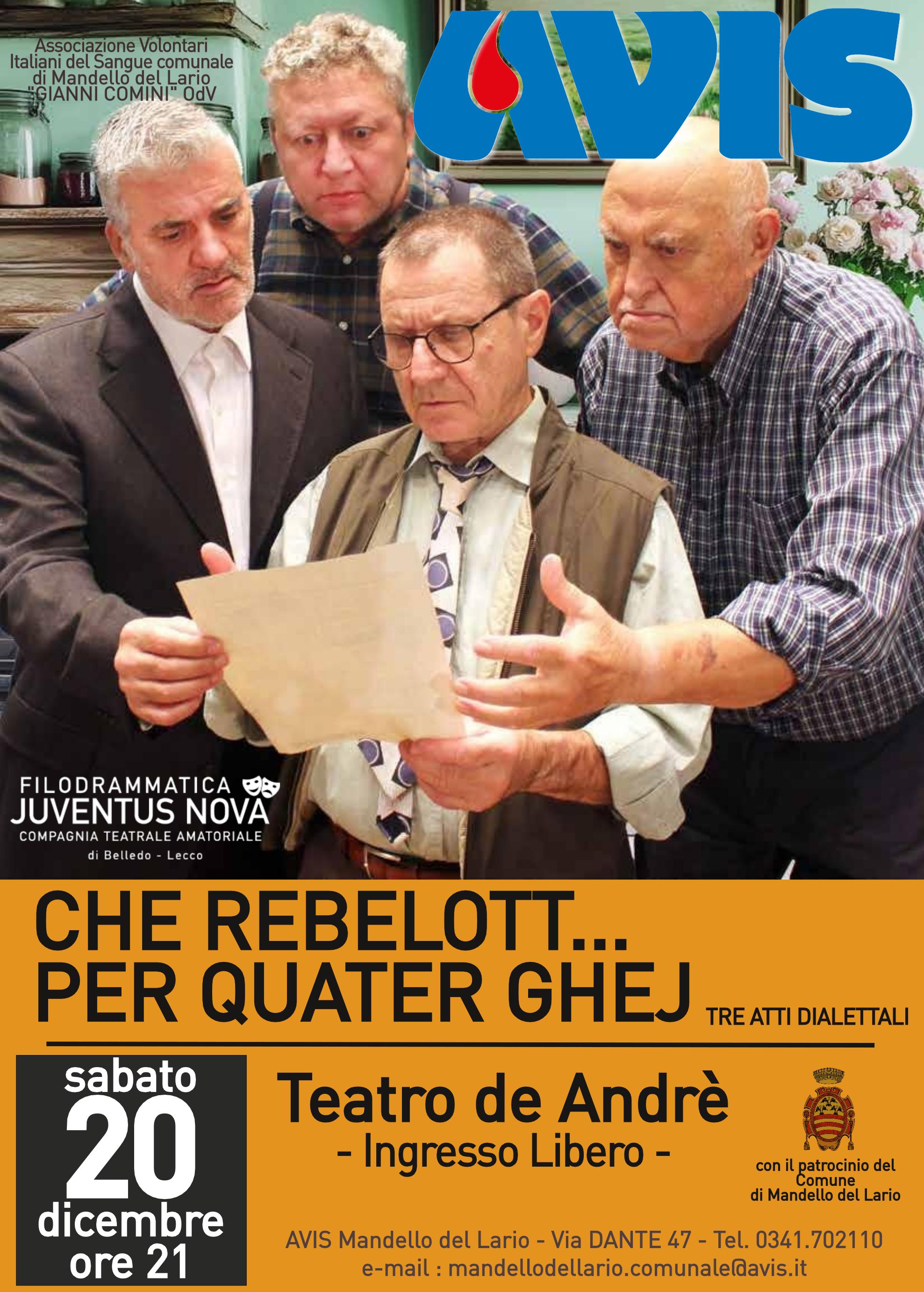 L'Associazione Volontari Italiani del Sangue comunale di Mandello del Lario “Gianni Comini” ODV, con il patrocinio del Comune di Mandello del Lario, organizza sabato 20 dicembre alle ore 21:00, presso il Teatro Comunale Fabrizio De André, lo spettacolo “Che rebelott... per quater ghej”, portato in scena dalla compagnia teatrale amatoriale Juventus Nova.