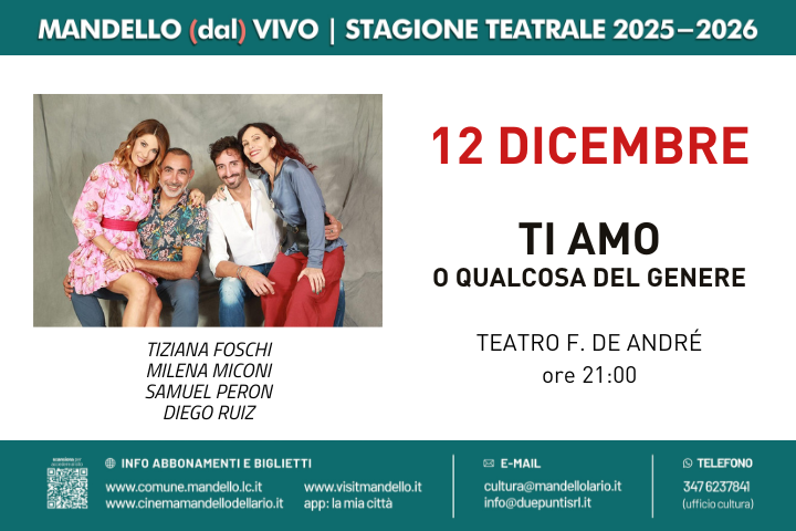 prevendita a partire dal 23 ottobre: online tramite link https://www.webtic.it/#/shopping?action=loadLocal&localId=5764; presso Ufficio Cultura Via Manzoni 44/3 nei giorni lunedì-martedì-mercoledì-venerdì dalle 10.00 alle 13.00.
