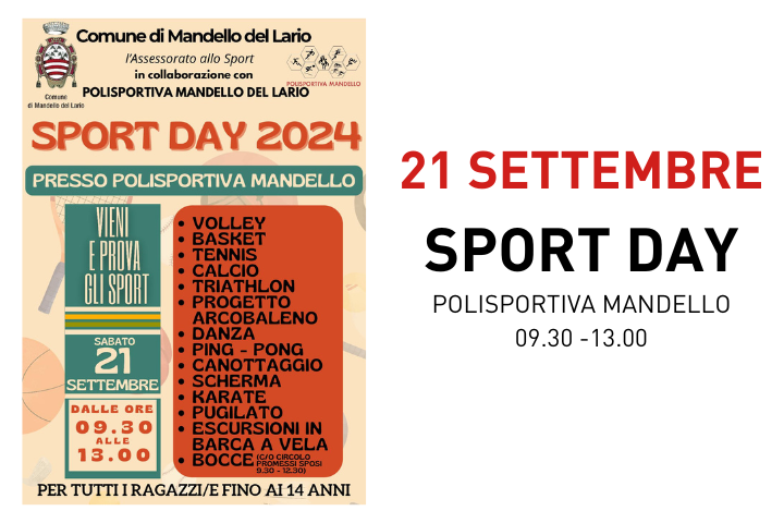 L'Assessorato allo Sport del Comune di Mandello del Lario, con la collaborazione della Polisportiva Mandello, è lieto di annunciare l'edizione 2024 della tradizionale "SPORT DAY", una giornata dedicata ai ragazzi e alle ragazze fino ai 14 anni.