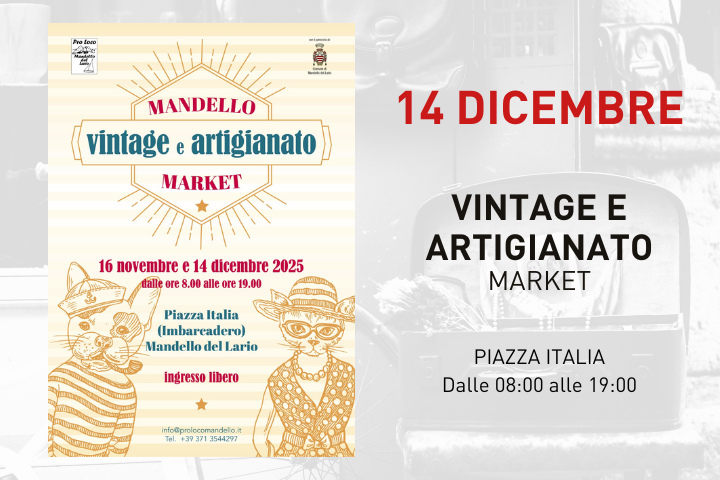 La Pro Loco di Mandello del Lario, con il patrocinio del Comune di Mandello del Lario, organizza per domenica 14 dicembre "Mandello vintage e artigianato market", dalle ore 08:00 alle 19:00 in piazza Italia.
